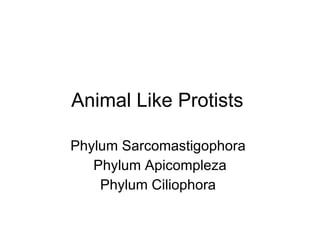 The document discusses several types of protozoa and protists, including those that are animal-like. It describes the characteristics of phyla Sarcomastigophora, Apicomplexa, and Ciliophora. Many protozoa are unicellular but have complex behaviors and life cycles. They can be photosynthetic, parasitic, or form symbiotic relationships with other organisms. Reproduction may involve asexual or sexual phases through binary fission or sporogony.
