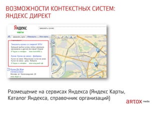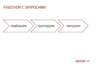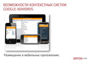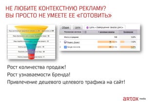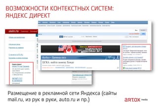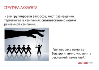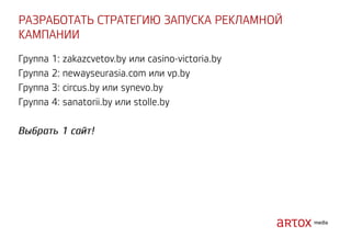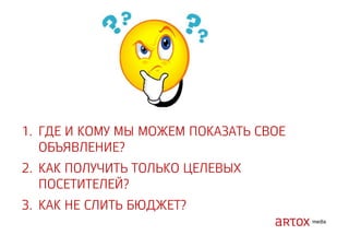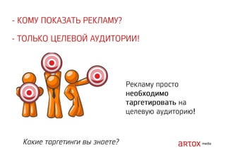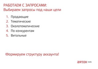 Документ содержит стратегические рекомендации по оптимизации интернет-маркетинга и увеличению продаж через привлечение трафика на сайт. Описаны методы аукционного размещения рекламы, включая использование ключевых слов, геотаргетинг и ретаргетинг. Указаны категории запрещенных тем и примеры инструментов для реализации рекламных кампаний.