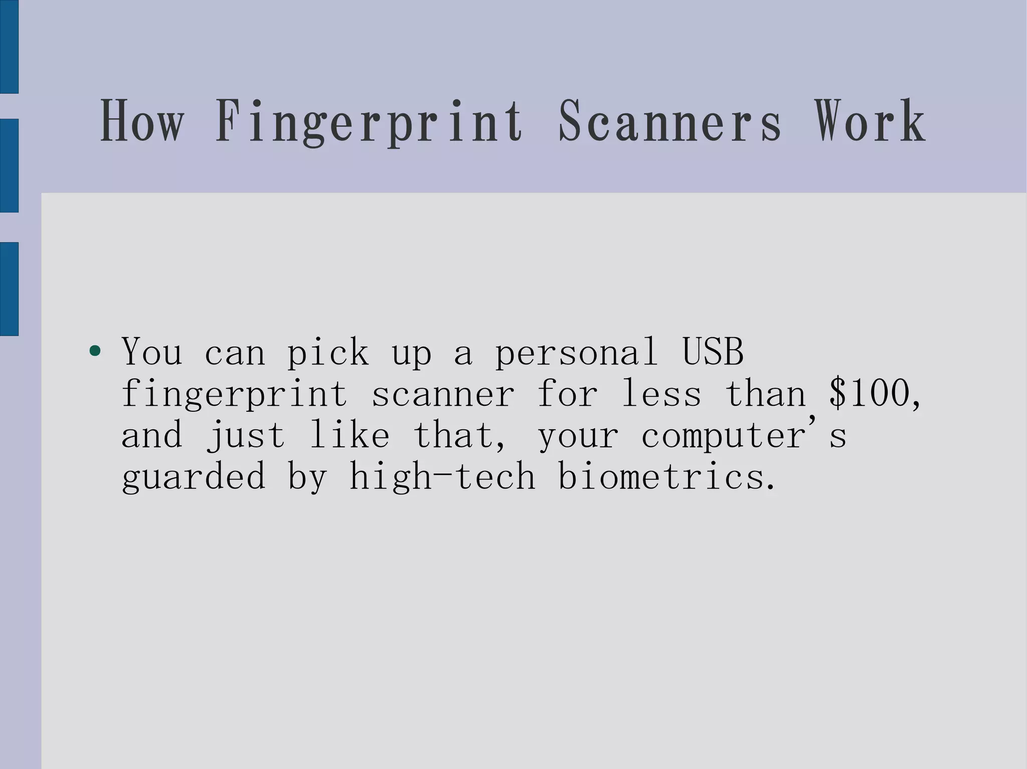 Fingerprint scanners work by using either optical or capacitive sensors to generate an image of a fingerprint's unique ridge and valley patterns. The scanner system then uses complex algorithms to analyze minutiae points within the patterns and compare them to stored fingerprints, looking for a sufficient number of matching points to verify a person's identity.