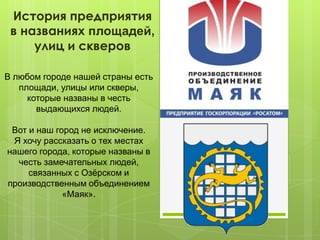 Документ описывает историю названий площадей, улиц и скверов в городе Озерск, имеющих отношение к выдающимся людям, связанным с производственным объединением 'Маяк'. В тексте приведены биографии и значимость таких фигур, как Игорь Курчатов, Борис Брохович и другие, а также подробности о памятных досках и переименованиях улиц. Основной акцент сделан на их вкладе в развитие города и атомной промышленности.