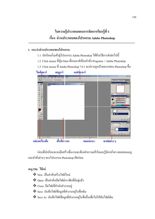 1 เรื่อง ส่ วนประกอบของโปรแกรม Adobe Photoshop 1. แนะนาส่ วนประกอบของโปรแกรม 1.1 นักเรี ยนเริ่ มเข้าสู่ โปรแกรม Adobe Photoshop ได้ดวยวิธีการดังต่อไปนี้ ้ 1.2 Click mouse ที่ปุ่ม Start เลื่อนเมาส์เลือกคาสั่ง Programs > Adobe Photoshop 1.3 Click mouse ที่ Adobe Photoshop 7.0.1 จะปรากฏหน้าจอแรกของ Photoshop ขึ้น ก่อนที่นกเรี ยนจะลงมือสร้างชิ้นงานจะต้องทาความเข้าใจและรู ้จกหน้าตา ตลอดจนเมนู ั ั และคาสั่งต่างๆ ของโปรแกรม Photoshop เสี ยก่อน เมนู File ได้ แก่ New เป็ นคาสังสร้างไฟล์ใหม่ ่ ่ Open เป็ นคาสั่งเปิ ดไฟล์กราฟิ กที่มีอยูแล้ว Close ปิ ดไฟล์ที่กาลังทางานอยู่ ่ Save บันทึกไฟล์ขอมูลที่ทางานอยูในชื่อเดิม ้ ่ Save As บันทึกไฟล์ขอมูลที่ทางานอยูในชื่ออื่นเพื่อไม่ให้ทบไฟล์เดิม ้ ั