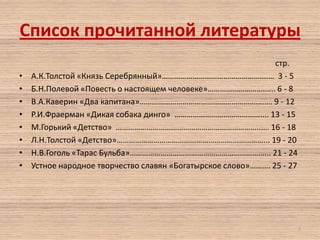 Документ представляет собой читательский дневник ученика 7 класса, в котором содержится список прочитанной литературы и краткие обзоры произведений, таких как 'Князь Серебряный' А.К. Толстого и 'Повесть о настоящем человеке' Б.Н. Полевого. Каждый обзор включает краткое содержание, характеризацию главных героев и личные впечатления читателя от прочитанного. Этот дневник иллюстрирует не только литературные предпочтения ученика, но и его взгляды на историю и героизм.