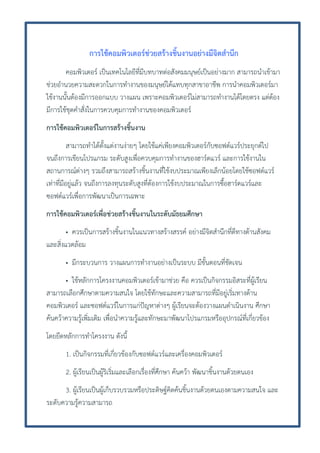 การนาคอมพิวเตอร์มา ใช้งานนั้นต้องมีการออกแบบ วางแผน เพราะคอมพิวเตอร์ไม่สามารถทางานได้โดยตรง แต่ต้อง มีการใช้ชุดคาสังในการควบคุมการทางานของคอมพิวเตอร์ ่ การใช้คอมพิวเตอร์ในการสร้างชิ้นงาน สามารถทาได้ตั้งแต่งานง่ายๆ โดยใช้แค่เพียงคอมพิวเตอร์กับซอฟต์แวร์ประยุกต์ไป จนถึงการเขียนโปรแกรม ระดับสูงเพื่อควบคุมการทางานของฮาร์ดแวร์ และการใช้งานใน สถานการณ์ต่างๆ รวมถึงสามารถสร้างชิ้นงานที่ใช้งบประมาณเพียงเล็กน้อยโดยใช้ซอฟต์แวร์ เท่าที่มีอยู่แล้ว จนถึงการลงทุนระดับสูงที่ต้องการใช้งบประมาณในการซื้อฮาร์ดแวร์และ ซอฟต์แวร์เพื่อการพัฒนาเป็นการเฉพาะ การใช้คอมพิวเตอร์เพื่อช่วยสร้างชิ้นงานในระดับมัธยมศึกษา • ควรเป็นการสร้างชิ้นงานในแนวทางสร้างสรรค์ อย่างมีจิตสานึกที่ดีทางด้านสังคม และสิ่งแวดล้อม • มีกระบวนการ วางแผนการทางานอย่างเป็นระบบ มีขั้นตอนที่ชัดเจน • ใช้หลักการโครงงานคอมพิวเตอร์เข้ามาช่วย คือ ควรเป็นกิจกรรมอิสระที่ผู้เรียน สามารถเลือกศึกษาตามความสนใจ โดยใช้ทักษะและความสามารถที่มีอยู่เริ่มทางด้าน คอมพิวเตอร์ และซอฟต์แวร์ในการแก่ปัญหาต่างๆ ผู้เรียนจะต้องวางแผนดาเนินงาน ศึกษา ค้นคว้าความรู้เพิ่มเติม เพื่อนาความรู้และทักษะมาพัฒนาโปรแกรมหรืออุปกรณ์ที่เกี่ยวข้อง โดยยึดหลักการทาโครงงาน ดังนี้ 1. เป็นกิจกรรมที่เกี่ยวข้องกับซอฟต์แวร์และเครื่องคอมพิวเตอร์ 2. ผู้เรียนเป็นผู้ริเริ่มและเลือกเรื่องที่ศึกษา ค้นคว้า พัฒนาชิ้นงานด้วยตนเอง 3. ผู้เรียนเป็นผู้เก็บรวบรวมหรือประดิษฐ์คิดค้นชิ้นงานด้วยตนเองตามความสนใจ และ ระดับความรู้ความสามารถ