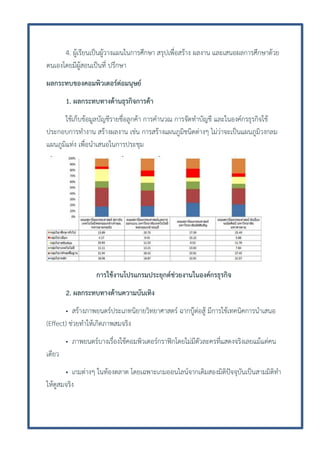 ผลงาน และเสนอผลการศึกษาด้วย ตนเองโดยมีผู้สอนเป็นที่ ปรึกษา ผลกระทบของคอมพิวเตอร์ต่อมนุษย์ 1. ผลกระทบทางด้านธุรกิจการค้า ใช้เก็บข้อมูลบัญชีรายชื่อลูกค้า การคานวณ การจัดทาบัญชี และในองค์กรธุรกิจใช้ ประกอบการทางาน สร้างผลงาน เช่น การสร้างแผนภูมิชนิดต่างๆ ไม่ว่าจะเป็นแผนภูมิวงกลม แผนภูมิแท่ง เพื่อนาเสนอในการประชุม การใช้งานโปรแกรมประยุกต์ช่วยงานในองค์กรธุรกิจ 2. ผลกระทบทางด้านความบันเทิง • สร้างภาพยนตร์ประเภทนิยายวิทยาศาสตร์ ฉากบู๊ต่อสู้ มีการใช้เทคนิคการนาเสนอ (Effect) ช่วยทาให้เกิดภาพสมจริง • ภาพยนตร์บางเรื่องใช้คอมพิวเตอร์กราฟิกโดยไม่มีตัวละครที่แสดงจริงเลยแม้แต่คน เดียว • เกมต่างๆ ในท้องตลาด โดยเฉพาะเกมออนไลน์จากเดิมสองมิติปัจจุบันเป็นสามมิติทา ให้ดูสมจริง