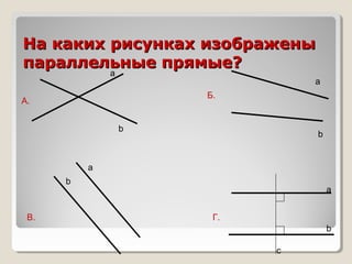 Документ содержит задания по определению параллельности прямых на основе различных угловых отношений. Упоминаются пары углов, таких как накрест лежащие, односторонние и соответственные углы. Также представлены условия и доказательства для проверки параллельности прямых a и b.