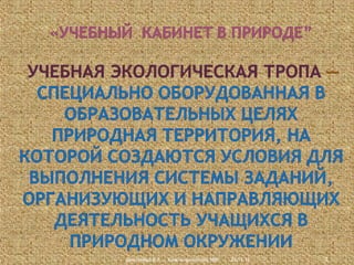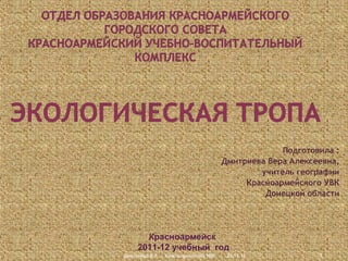 Документ описывает организацию экологических троп, подготовленных учителем географии Верой Алексеевной Дмитриевой в Красноармейском НВК. Он включает цели троп, состав рабочих групп, необходимые мероприятия и примеры существующих маршрутов, ориентированных на изучение природы и экологии. Также предлагаются описания конкретных экскурсионных объектов и велопутешествий для знакомства с местной природой.