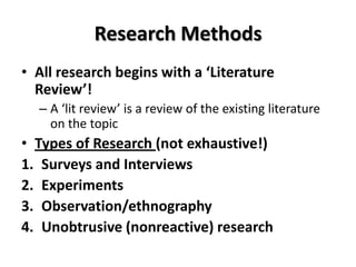 The document provides an overview of various research methods including literature reviews, surveys, experiments, observation, and unobtrusive research. It discusses key aspects of each method such as defining experimental and control groups in experiments, guidelines for crafting survey questions, and strategies for field research observation. The goal is to introduce students to the fundamental techniques used in social science research.