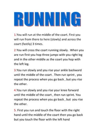 The document outlines a series of exercises to be performed on a court or floor. It describes running exercises including running from one side of the court to the other slowly and fast, hopping with different legs, and touching the floor with different hands. It also lists pairs exercises including opening legs and having a partner try to kiss the floor, sitting and joining feet to touch the floor with knees, and stretching arms. Further exercises include rotating elbows, moving shoulders and bending joints, putting head back and moving it side to side, and lying down to perform leg lifts, pushups, reaching feet and trunk lifts.