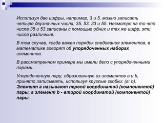 Содержимое лекции посвящено декартовому произведению множеств, которое формируется из всех возможных упорядоченных пар, где первая компонента принадлежит одному множеству, а вторая — другому. В лекции также обсуждаются различные способы представления декартового произведения, его свойства и количество элементов в результате, а также примеры и задачи для наглядного понимания. Подводится итог с применением концепции к дидактическим материалам и решению задач.