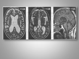 #50 На Т2-зважених зображеннях (112А, В) видно розширені III та бокові шлуночки. На сагіттальному знімку в режимі Т1 виявляється розтягнутий III шлуночок, а вище нього - прогин мозолистого тіла. Ніяких патологічних утворень, які б пояснювали розширення шлуночків не знайдено. Зверніть увагу на диспропорцію між розтягненням шлуночків та відносно невеликим зниженням периферичного об'єму кори (I).