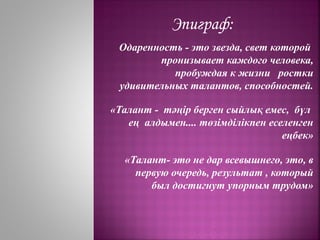Документ обсуждает важность выявления и развития талантов у учащихся в Казахстане, подчеркивая задачи семьи, школ и учителей в этом процессе. Одаренность определяется как системное качество, приводящее к выдающимся достижениям, и рассматриваются различные виды одаренности, включая интеллектуальную, академическую и художественную. Акцент сделан на раннем выявлении способностей детей и необходимости соответствующих условий для их развития.