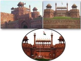 The Red Fort in Delhi was constructed in the 17th century by the Mughal emperor Shah Jahan as the palace of the Mughal emperors and capital city. It served as the capital until 1857. The fort covers 254 acres within high sandstone walls and features many ornate buildings like the Diwan-i-Aam hall and private royal apartments connected by water channels representing paradise. Important structures include the main Lahore Gate where Independence Day celebrations are held, as well as buildings showcasing the peak of Mughal architecture, art, and ornamentation. The Red Fort was designated a UNESCO World Heritage Site in 2007 and remains an important historic site representing India's Mughal era.