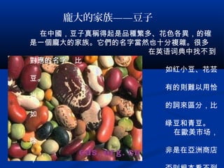 龐大的家族——豆子 在中國,豆子真稱得起是品種繁多、花色各異,的確 是一個龐大的家族。它們的名字當然也十分複雜。很多 在英语词典中找不到 對應的名字,比 如红小豆、花芸 豆。 有的則難以用恰 当 的詞來區分,比 如 绿豆和青豆。 在歐美市场, 除 非是在亞洲商店 ,