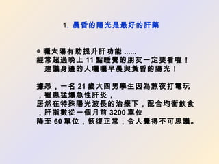 本文件探讨了阳光对肝脏健康的益处,强调晨光和夕阳的红光能改善肝功能,并提到针对年轻人肝炎的新研究理论。同时,介绍了踮脚尖运动对健康的益处,包括增强心血管功能和改善肾脏健康,最后提醒70岁以上的人应关注自身健康和幸福,而非财产的积累与子女的支持。