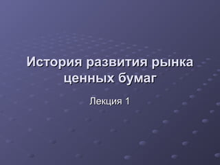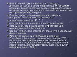 Документ освещает историю развития рынка ценных бумаг в России, начиная с дореволюционного периода и заканчивая современностью, акцентируя внимание на ключевых этапах, таких как приватизация и создание корпоративных ценных бумаг. Подчеркивается важность регулирования для стабилизации этого сектора экономики и развития новых видов ценных бумаг. Также описываются различные типы рынков ценных бумаг и участники, занимающиеся их обращением.