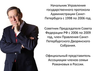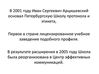 Иван Сергеевич Арцишевский занимал ключевые должности в государственном протоколе Санкт-Петербурга с 1998 по 2009 год, включая советника председателя Совета Федерации. Он также был официальным представителем ассоциации членов семьи Романовых в России. В 2001 году он основал первую в стране школу протокола и этикета, которая позже была реорганизована в Центр эффективных коммуникаций.