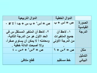 تتناول الوثيقة موضوع تمثيل الدوال التربيعية، حيث تشرح خصائص الدوال التربيعية وخطوط تماثلها، وطرق تحديد القيم العظمى والصغرى عبر معادلاتها. بالإضافة إلى ذلك، تقدم الوثيقة أمثلة عملية باستخدام الجداول البيانية لتوضيح المفاهيم. يتضمن الشرح كيفية إيجاد المواضع الأساسية للدوال التربيعية مثل رأس الدالة ونقطة التقاء المحور الصادي.