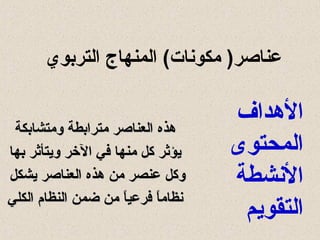 يتناول المستند عناصر المنهج التعليمي والمكونات الأساسية له، بما في ذلك الأهداف والمحتوى والأنشطة والتقويم، ويشير إلى ترابط هذه العناصر وتأثيرها المتبادل. يبرز أهمية تحديد الأهداف التعليمية وكيفية قياس التغيرات السلوكية بناءً على التجارب التعليمية للمتعلمين. كما يناقش تصنيفات المعرفة والمحتوى وكيفية اختيار المعايير المناسبة لضمان فعالية التعلم.
