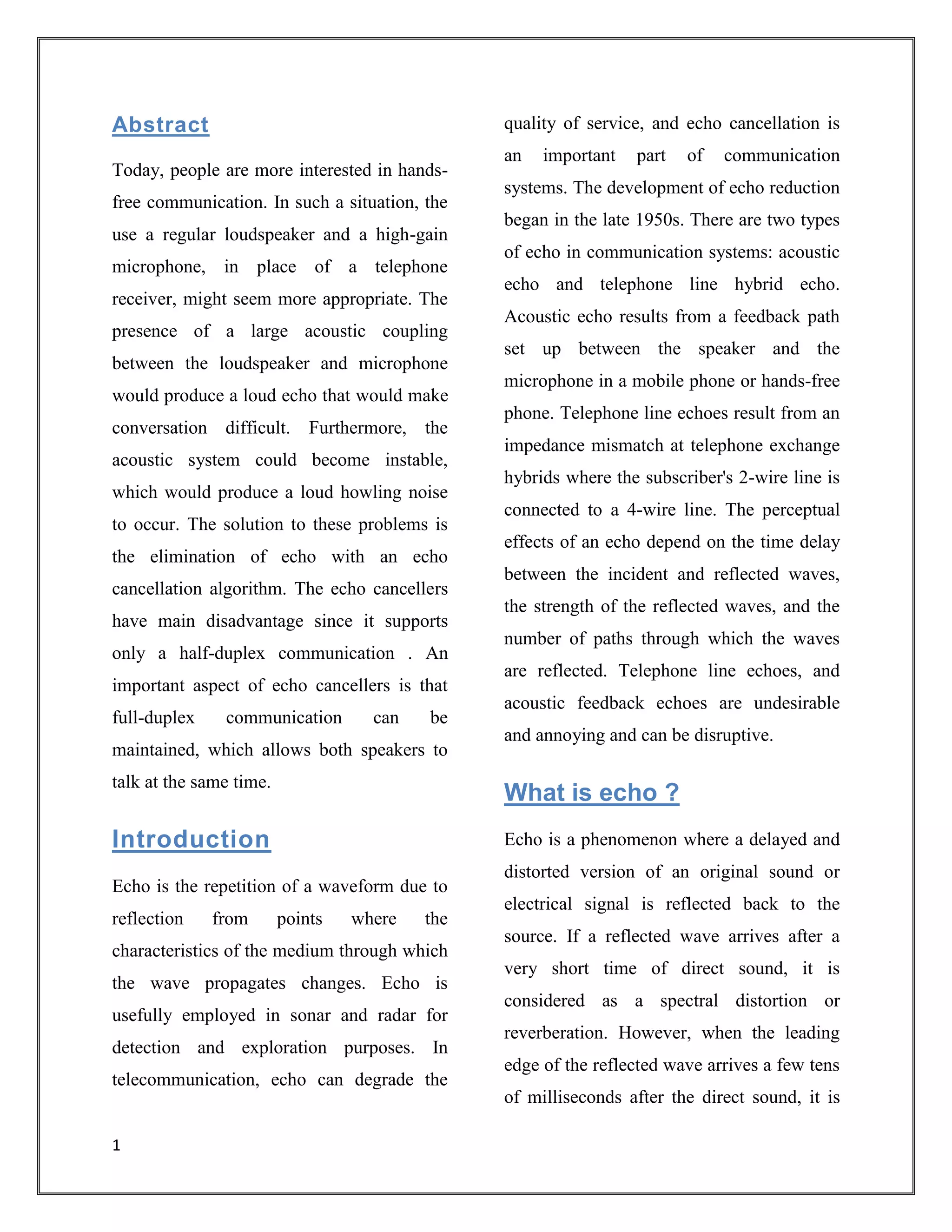 The document discusses the challenges posed by echo in telecommunication, focusing on two main types: acoustic echo and telephone line hybrid echo. It outlines the causes of these echoes, such as impedance mismatches and feedback paths, and describes various methods and algorithms, including adaptive filtering techniques, for echo cancellation in communication systems. The complexity of acoustic echo cancellation is highlighted due to its longer delays and the need for sophisticated modeling of acoustic environments.