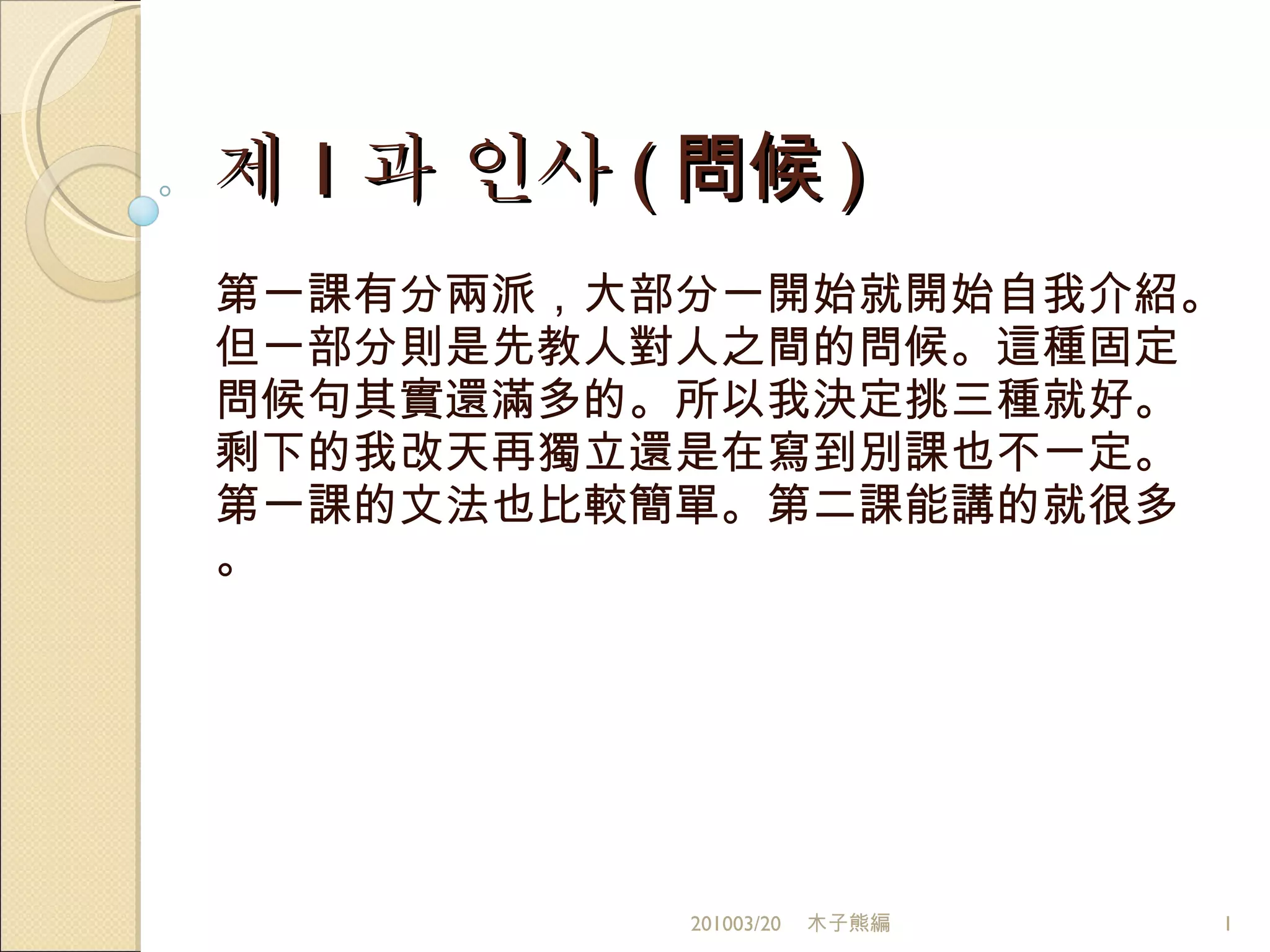 인사 ( 問候 ) 第一課有分兩派,大部分一開始就開始自我介紹。但一部分則是先教人對人之間的問候。這種固定問候句其實還滿多的。所以我決定挑三種就好。剩下的我改天再獨立還是在寫到別課也不一定。第一課的文法也比較簡單。第二課能講的就很多。 201003/20 木子熊編