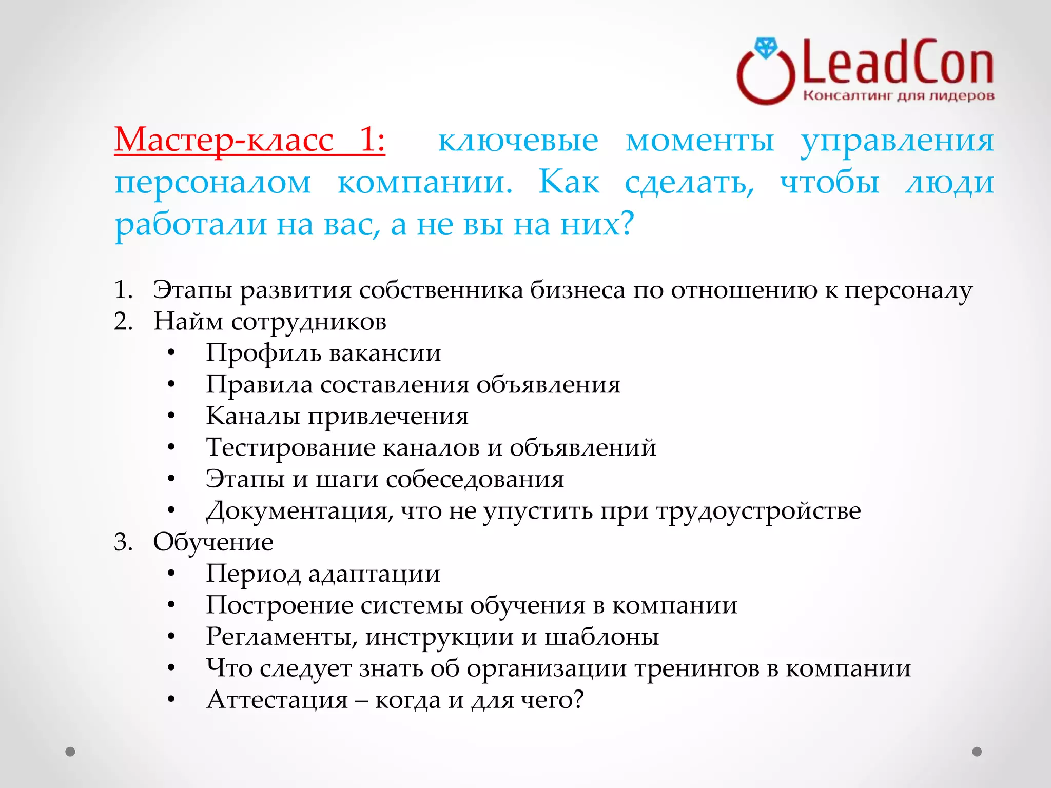 Документ описывает ключевые аспекты управления бизнесом, включая найм, обучение, мотивацию и увольнение персонала, а также управление временем и конфликтами. В нем рассматриваются стратегии продаж и интернет-рекламы, акцентируется внимание на принципах маркетинга и финансового планирования. Также содержатся мастер-классы, направленные на развитие личной эффективности и успешное ведение бизнеса в современных условиях.