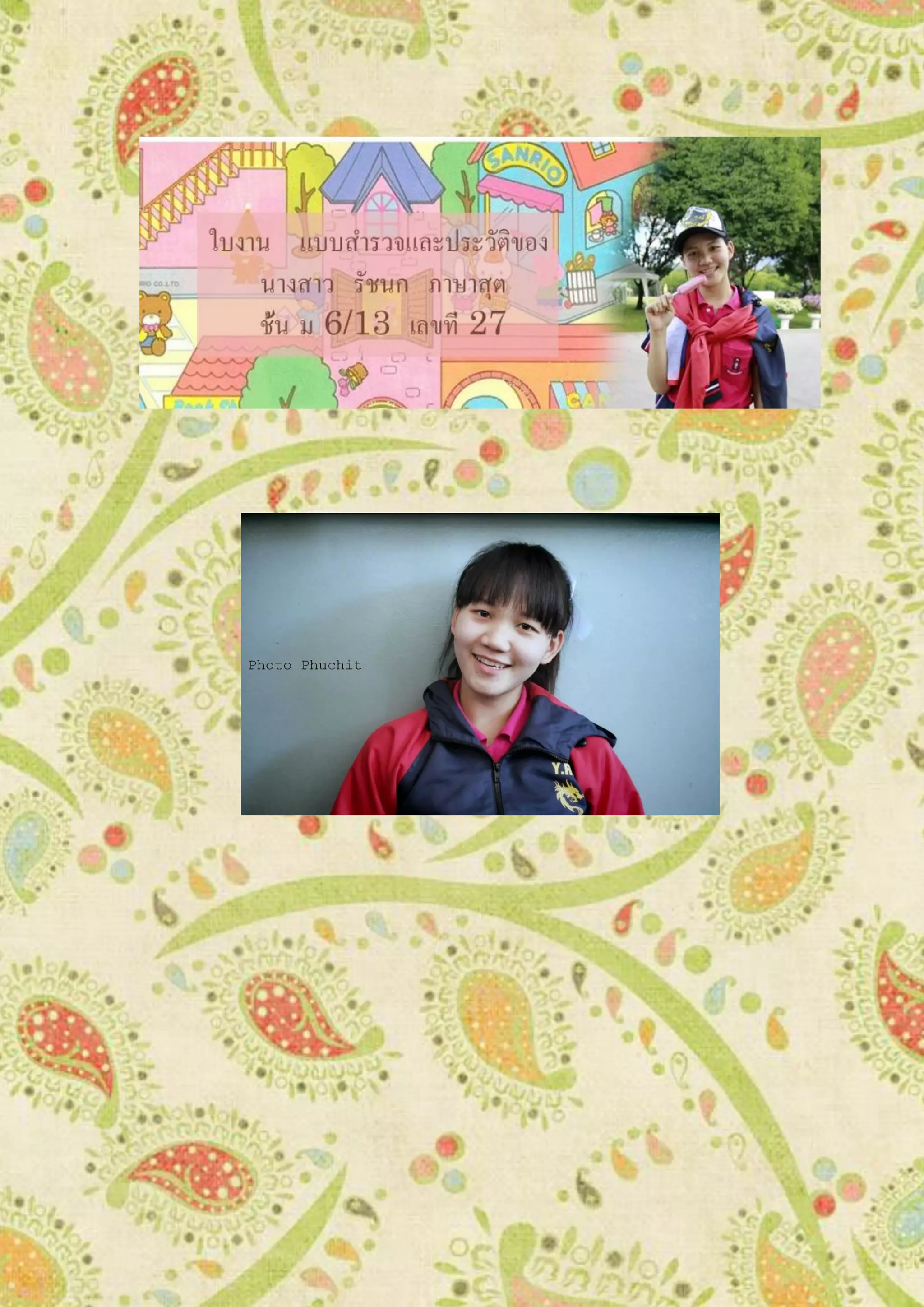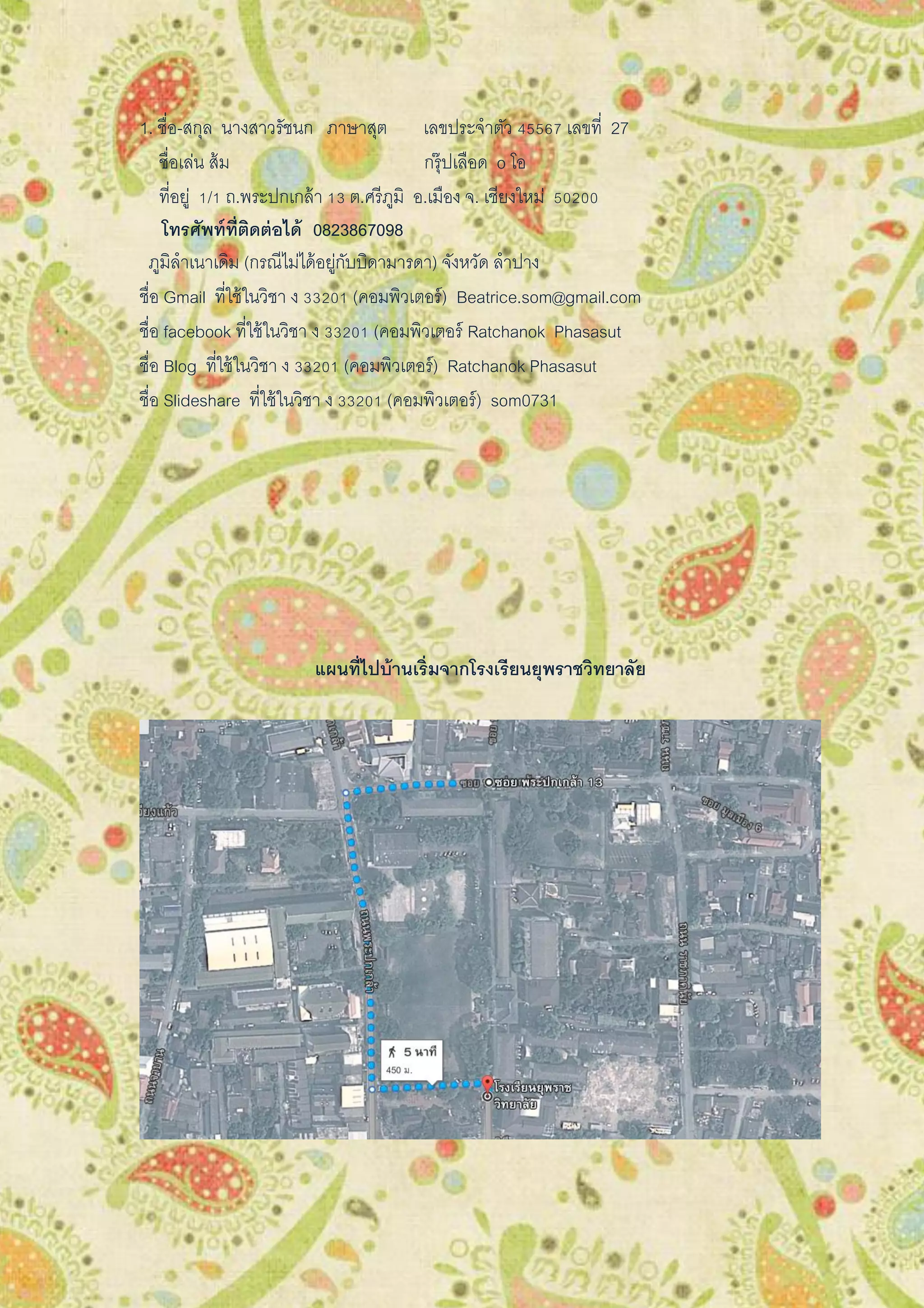 ภาษาสุต เลขประจาตัว 45567 เลขที่ 27 ชื่อเล่น ส้ม กรุ๊ปเลือด o โอ ที่อยู่ 1/1 ถ.พระปกเกล้า 13 ต.ศรีภูมิ อ.เมือง จ. เชียงใหม่ 50200 โทรศัพท์ที่ติดต่อได้ 0823867098 ภูมิลาเนาเดิม (กรณีไม่ได้อยู่กับบิดามารดา) จังหวัด ลาปาง ชื่อ Gmail ที่ใช้ในวิชา ง 33201 (คอมพิวเตอร์) Beatrice.som@gmail.com ชื่อ facebook ที่ใช้ในวิชา ง 33201 (คอมพิวเตอร์ Ratchanok Phasasut ชื่อ Blog ที่ใช้ในวิชา ง 33201 (คอมพิวเตอร์) Ratchanok Phasasut ชื่อ Slideshare ที่ใช้ในวิชา ง 33201 (คอมพิวเตอร์) som0731 แผนที่ไปบ้านเริ่มจากโรงเรียนยุพราชวิทยาลัย