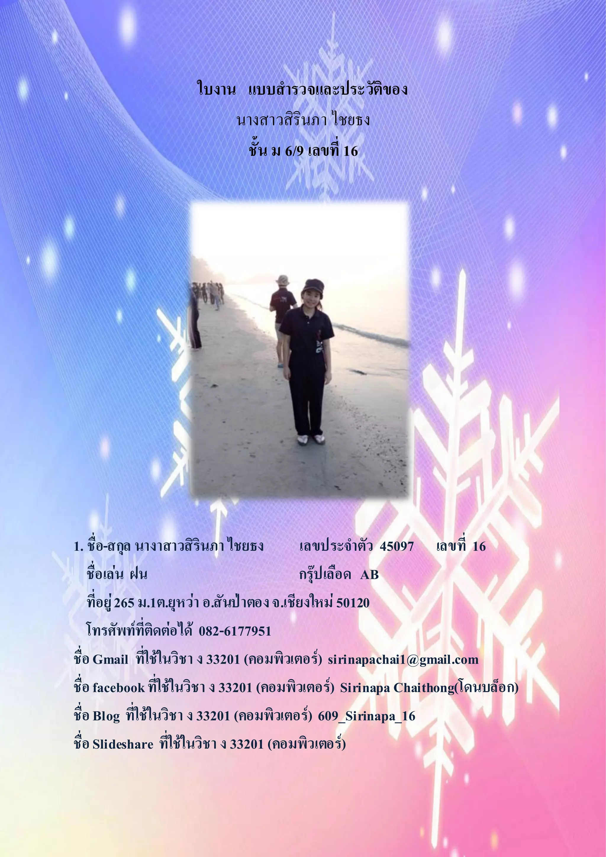 ม 6/9 เลขที่ 16 1. ชื่อ-สกุล นางาสาวสิรินภา ไชยธง เลขประจาตัว 45097 เลขที่ 16 ชื่อเล่น ฝน กรุ๊ปเลือด AB ที่อยู่265 ม.1ต.ยุหว่า อ.สันป่าตองจ.เชียงใหม่ 50120 โทรศัพท์ที่ติดต่อได้ 082-6177951 ชื่อGmail ที่ใช้ในวิชา ง 33201 (คอมพิวเตอร์) sirinapachai1@gmail.com ชื่อfacebookที่ใช้ในวิชา ง 33201 (คอมพิวเตอร์) Sirinapa Chaithong(โดนบล็อก) ชื่อBlog ที่ใช้ในวิชา ง 33201 (คอมพิวเตอร์) 609_Sirinapa_16 ชื่อSlideshare ที่ใช้ในวิชา ง 33201 (คอมพิวเตอร์)