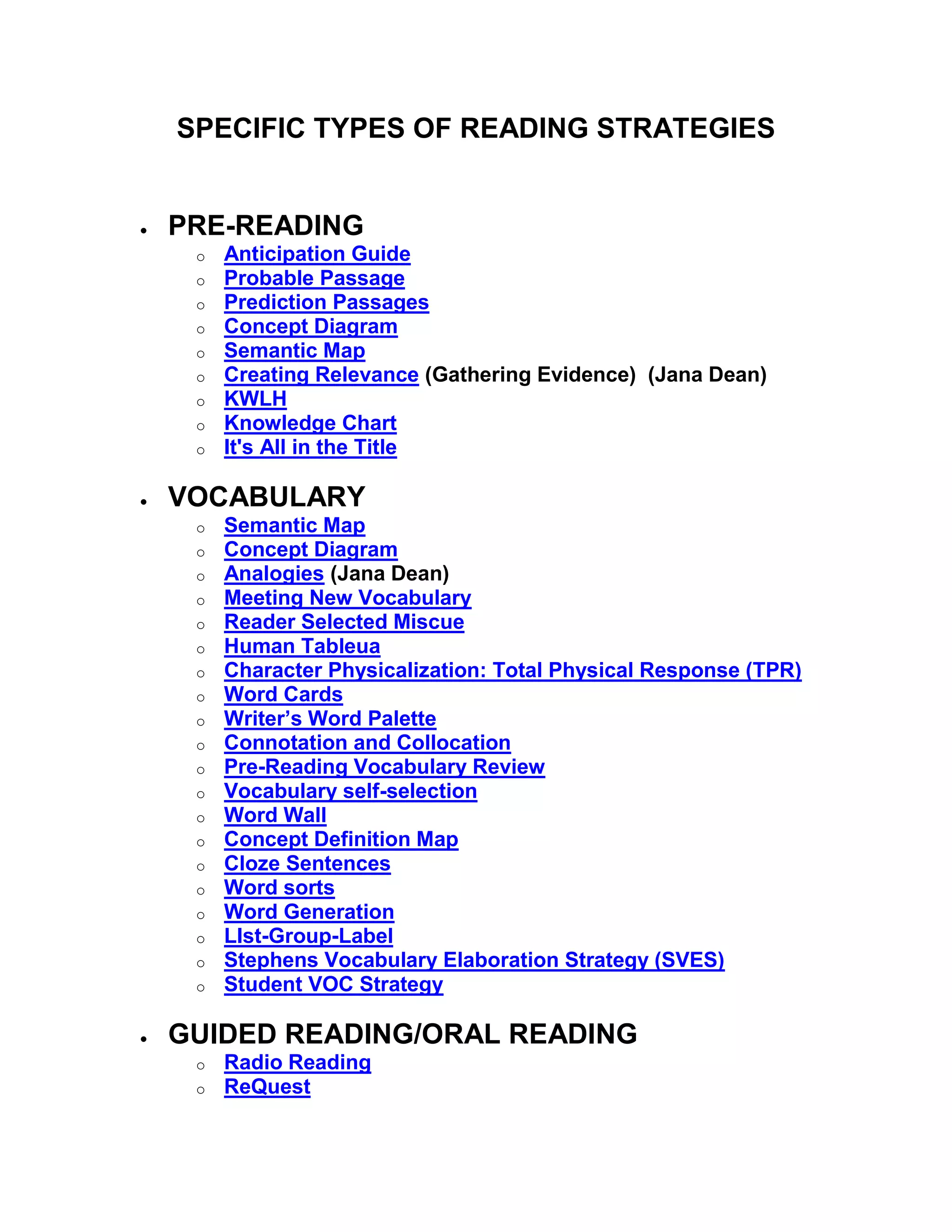 The document outlines several pre-reading, vocabulary, guided reading, and post-reading strategies for developing reading comprehension. Some strategies include having students make predictions before reading, create semantic maps and diagrams of vocabulary words, engage in guided reading activities like radio reading and discussion webs, and complete post-reading activities like writing in learning logs or thinking sheets. Specific vocabulary strategies involve creating word cards, concept definition maps, and sorting words by meaning.