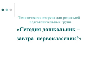 В документе обсуждается подготовка детей к школе, акцентируя внимание на формировании психологической готовности, которая включает интеллектуальную, эмоциональную, социальную и волевую сферы. Поскольку подготовка не сводится лишь к обучению чтению и письму, подчеркиваются важные аспекты, такие как развитие речи, мотивации и эмоциональной устойчивости. Описаны уровни готовности к школьному обучению, от высокого до низкого, а также модель успешного выпускника детского сада.