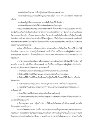 มักขึ้นอยู่กับข้อมูลซึ่งได้จากระบบคอมพิวเตอร์ - คอมพิวเตอร์กลายเป็นเครื่องมือที่สาคัญแทนเครื่องมืออื่น ๆ ในอดีต เช่น เครื่องพิมพ์ดีด เครื่องคิดเลข เป็นต้น - คอมพิวเตอร์ถูกใช้ในการออกแบบสถานการณ์หรือปัญหาที่ซับซ้อนต่าง ๆ - คอมพิวเตอร์เป็นอุปกรณ์หลักที่ใช้ในการติดต่อสื่อสารของโลกปัจจุบัน นักเรียนในระดับมัธยมศึกษาเรียนวิทยาศาสตร์ธรรมชาติเพื่อความเข้าใจความเป็นไปของธรรมชาติใน โลก ในทานองเดียวกันนักเรียนต้องเรียนวิชาทางวิทยาการคอมพิวเตอร์เพื่อความเข้าใจในสังคม เศรษฐกิจ และ วัฒนธรรมของสังคมต่าง ๆ ในยุคสารสนเทศ เนื้อหาวิชาทางด้านเทคโนโลยีคอมพิวเตอร์ในโรงเรียนระดับ มัธยมศึกษามีเป้าหมายที่จะพัฒนานักเรียนให้มีความรู้ความเข้าใจในวิทยาการของคอมพิวเตอร์และมี ความสามารถในการพัฒนาโปรแกรมได้ ดังนั้นการจัดทาโครงงานคอมพิวเตอร์จะเป็นสิ่งที่ทาให้นักเรียนสามารถ บรรลุเป้าหมายได้อย่างสมบูรณ์ จุดมุ่งหมายที่สาคัญประการหนึ่งของการเรียนการสอนคอมพิวเตอร์ในโรงเรียน คือการที่นักเรียนได้มี โอกาสฝึกความสามารถในการนาความรู้เกี่ยวกับคอมพิวเตอร์ไปใช้ในการแก้ปัญหา ประดิษฐ์คิดค้นหรือค้นคว้า หาความรู้ต่าง ๆ ได้ด้วยตนเอง ซึ่งวิธีการที่มีประสิทธิภาพมากวิธีหนึ่งคือการที่นักเรียนได้มีโอกาสทาโครงงาน คอมพิวเตอร์ การทาโครงงานคอมพิวเตอร์และการจัดงานแสดงโครงงานจะมีคุณค่าต่อการฝึกฝนให้นักเรียนมีความรู้ ความชานาญ และมีความมั่นใจในการนาระบบคอมพิวเตอร์ไปใช้ในการแก้ปัญหา ประดิษฐ์คิดค้นหรือค้นคว้าหา ความรู้ต่าง ๆ ด้วยตนเองและยังมีคุณค่าอื่น ๆ อีกดังต่อไปนี้ 1. สร้างความสานึกและความรับผิดชอบในการศึกษาและพัฒนาระบบด้วยตนเอง 2. เปิดโอกาสให้นักเรียนได้พัฒนาและแสดงความสามารถตามศักยภาพของตนเอง 3. เปิดโอกาสให้นักเรียนได้ศึกษา ค้นคว้า และเรียนรู้ในเรื่องที่นักเรียนสนใจได้ลึกซึ้งกว่าการเรียนใน ห้องตามปกติ 4. ส่งเสริมและพัฒนากระบวนการคิด การแก้ปัญหา การตัดสินใจ รวมทั้งการสื่อสารระหว่างกัน 5. กระตุ้นให้นักเรียนมีความสนใจในการเรียนวิชาสาขาคอมพิวเตอร์ และมีความสนใจที่จะประกอบ อาชีพทางด้านนี้ 6. ส่งเสริมให้นักเรียนได้ใช้เวลาอย่างเป็นประโยชน์ในทางสร้างสรรค์ 7. สร้างความสัมพันธ์ระหว่างนักเรียนกับครูและชุมชน รวมทั้งส่งเสริมให้ชุมชนสนใจคอมพิว เตอร์และ เทคโนโลยีที่เกี่ยวข้องมากขึ้น 8. เป็นการบูรณาการเอาความรู้จากวิชาต่าง ๆ ที่ได้รับมาจัดทาผสมผสานกับโปรแกรมคอมพิวเตอร์เป็น โครงงานเพื่อนาเสนอต่อชุมชน 
