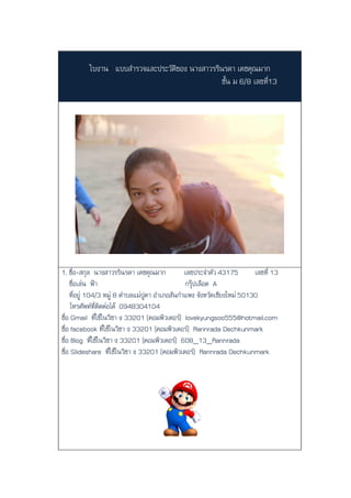 เดชคุณมาก ชั้น ม 6/8 เลขที่13 1. ชื่อ-สกุล นางสาวรรินรดา เดชคุณมาก เลขประจาตัว 43175 เลขที่ 13 ชื่อเล่น ฟ้า กรุ๊ปเลือด A ที่อยู่ 104/3 หมู่ 8 ตาบลแม่ปูคา อาเภอสันกาแพง จังหวัดเชียงใหม่ 50130 โทรศัพท์ที่ติดต่อได้ 0948304104 ชื่อ Gmail ที่ใช้ในวิชา ง 33201 (คอมพิวเตอร์) lovekyungsoo555@hotmail.com ชื่อ facebook ที่ใช้ในวิชา ง 33201 (คอมพิวเตอร์) Rarinrada Dechkunmark ชื่อ Blog ที่ใช้ในวิชา ง 33201 (คอมพิวเตอร์) 608_13_Rarinrada ชื่อ Slideshare ที่ใช้ในวิชา ง 33201 (คอมพิวเตอร์) Rarinrada Dechkunmark