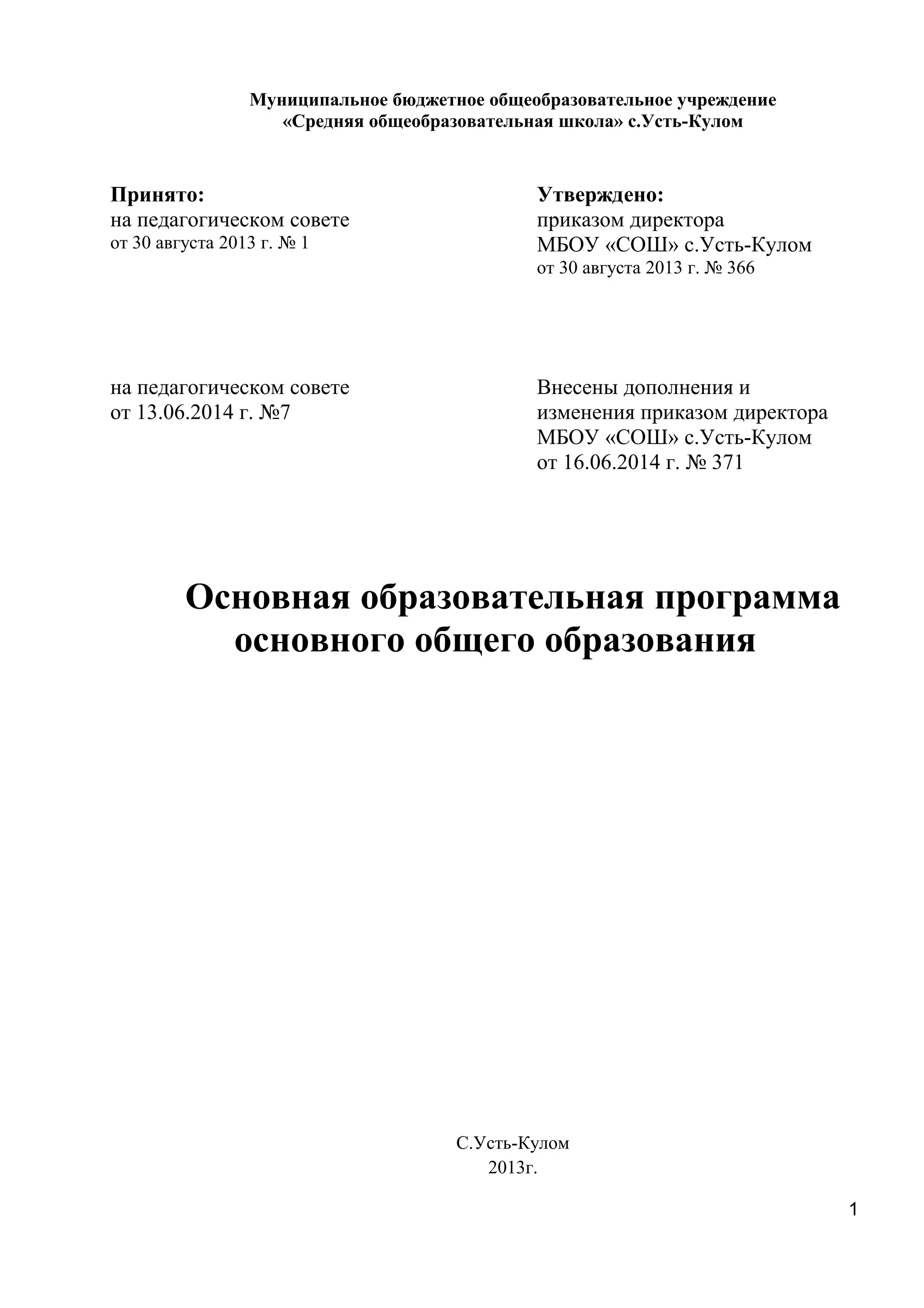 Документ содержит основную образовательную программу основного общего образования для муниципального бюджетного общеобразовательного учреждения «средняя общеобразовательная школа» села Усть-Кулом, разработанную в соответствии с федеральными стандартами. Программа включает целевой, содержательный и организационный разделы, охватывающие цели, содержание и организацию образовательного процесса, а также мероприятия по социализации и воспитанию учеников. Основное внимание уделяется развитию личности и подготовке выпускников к будущей жизни, учитывая психологические особенности подросткового возраста.