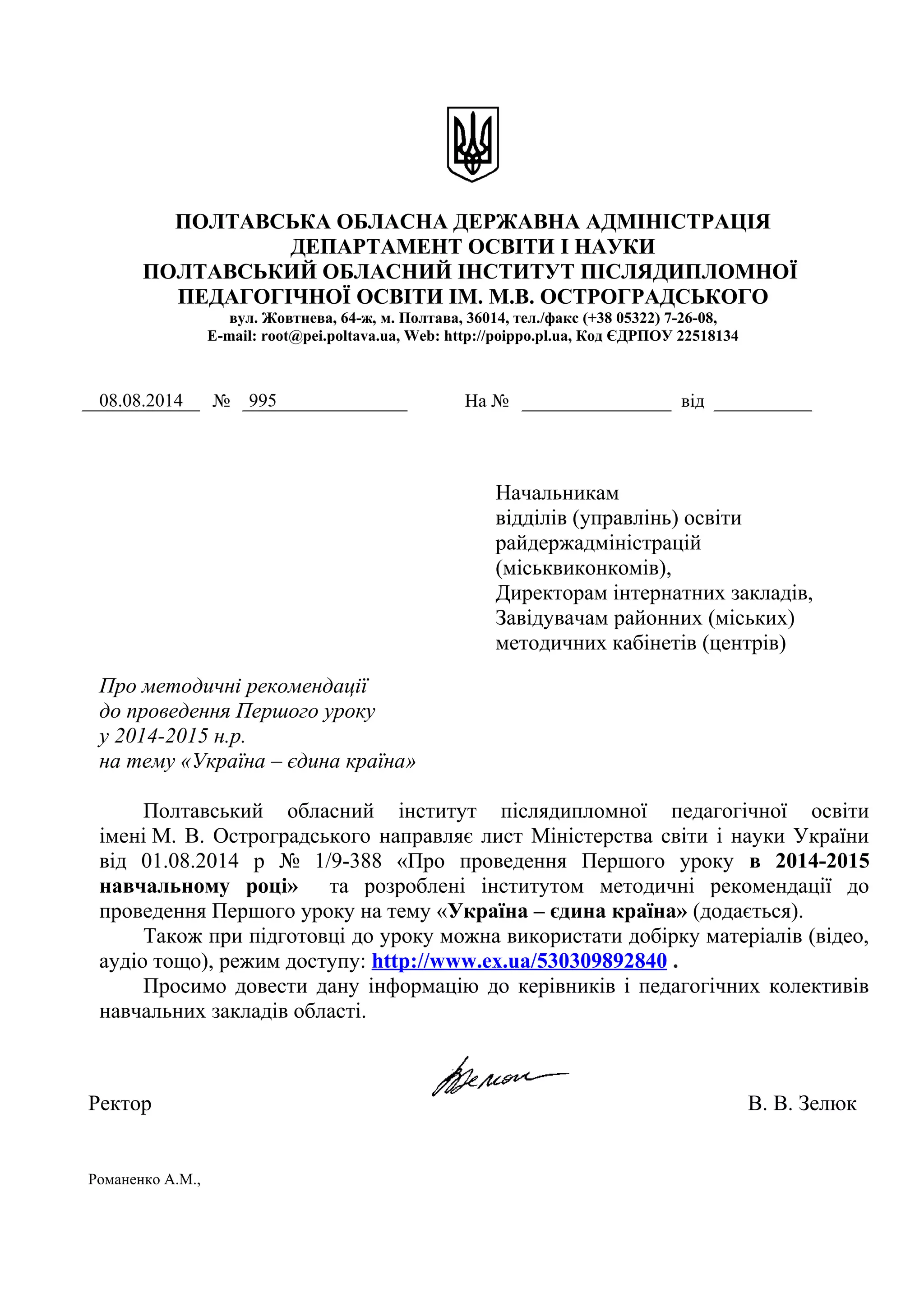 від 01.08.2014 р № 1/9-388 «Про проведення Першого уроку в 2014-2015