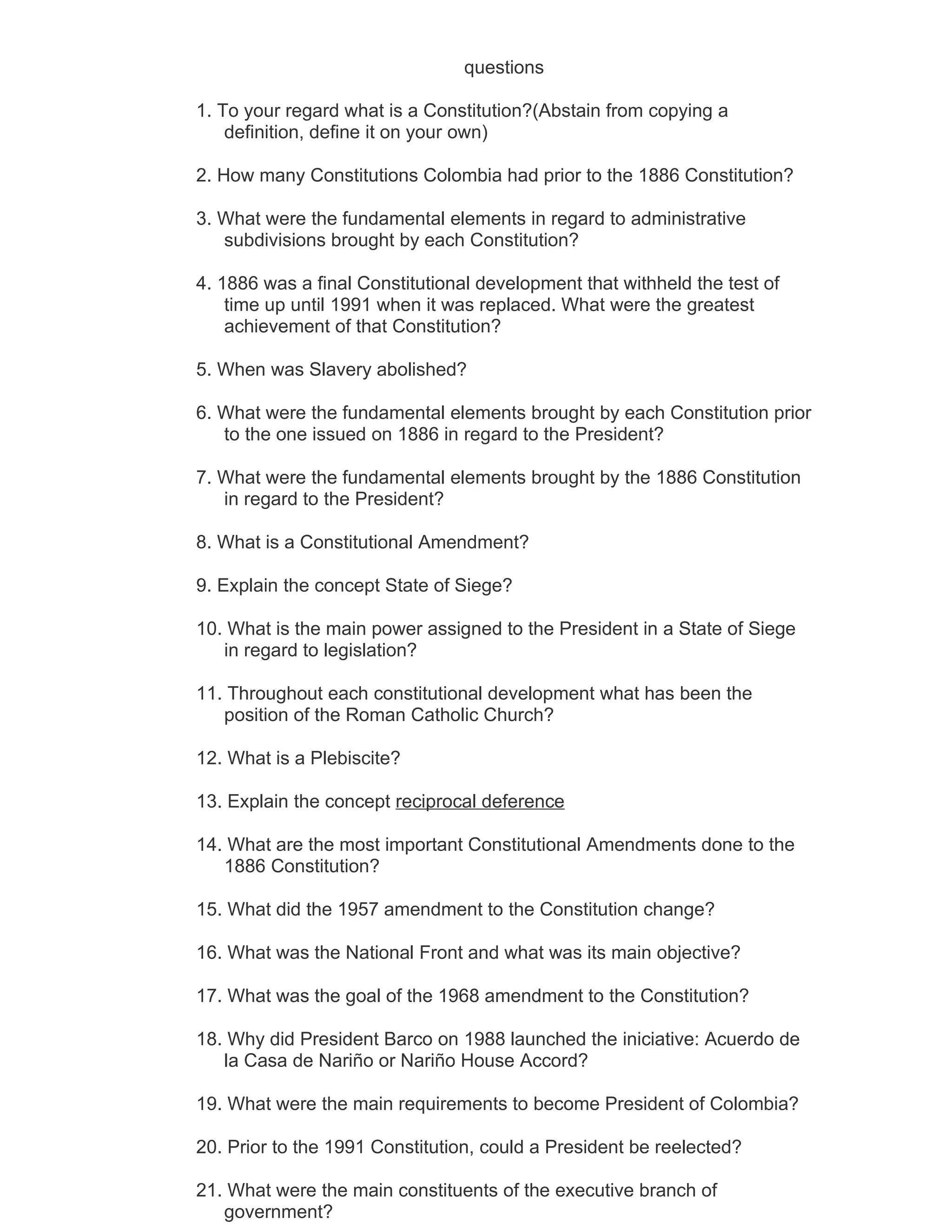 This document contains 57 questions about Colombia's constitutions, government, and history. It asks about topics like the number of constitutions before 1886, elements they introduced, achievements of the 1886 constitution, when slavery was abolished, the president's role and powers, constitutional amendments, the concept of a state of siege, the position of the Catholic Church, plebiscites, the executive and legislative branches, and the administrative divisions of government. The questions cover Colombia's constitutions, political system, and administrative structure in detail from the 1800s through the late 20th century.