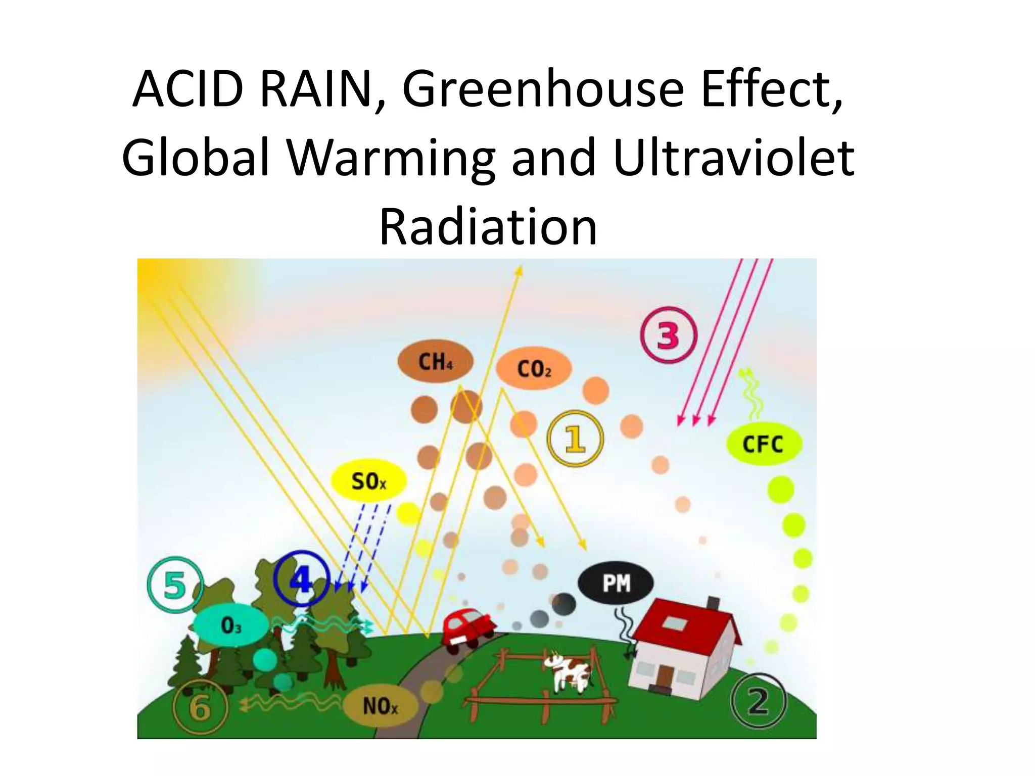 2) The greenhouse effect refers to the atmosphere trapping heat from the sun, warming the Earth's surface. Increased CO2 and methane from human activities like burning fossil fuels and deforestation enhance the greenhouse effect and global warming.