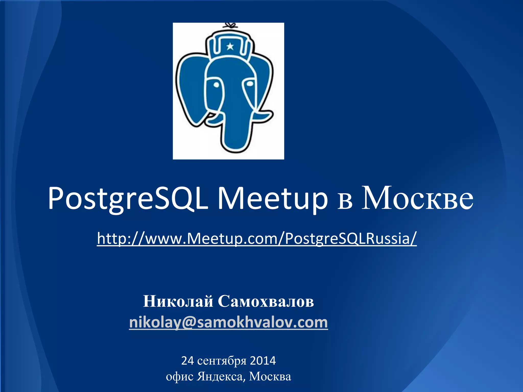 Документ содержит информацию о сообществе PostgreSQL в России, включая анонсы встреч и конференций, такие как PG Master'14 в Санкт-Петербурге и обсуждения перехода организаций на PostgreSQL. Также рассматриваются нововведения в версии 9.4, такие как производительность, поддержка JSON и JSONB, а также улучшения для администраторов и разработчиков. Упоминаются ресурсы и литература для изучения PostgreSQL, а также статистика популярности СУБД.