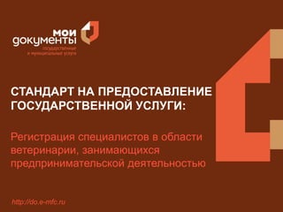 Документ описывает стандарт предоставления государственной услуги по регистрации специалистов в области ветеринарии, включая информацию о безвозмездности услуги, необходимых документах и категориях заявителей. Указывается на основания для отказа в приеме документов и предоставлении услуги, а также общий срок выполнения процедуры — до 30 дней. Результатом предоставления услуги является выдача свидетельства о регистрации.