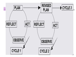 วิทยากรวิจัยชั้นเรียนสถาบันวิจัย[1].สุธาสินี 1. 2. วิจัยชั้นเรียน 6. กรณีศึกษางานวิจัย 5. การเผยแพร่และใช้ประโยชน์ - การเขียนรายงานการวิจัย - คุณภาพงานวิจัย 1. มโนทัศน์การวิจัย ในชั้นเรียน - ความหมาย - ความสำคัญ - ข้อเสนอ - บทบาทครูในฐานะ นักวิจัย 3. นวัตกรรมการเรียนการสอน กับการวิจัยในชั้นเรียน - แนวทางพัฒนา - ความสัมพันธ์ - การหาประสิทธิภาพ 2. รูปแบบและกระบวนการ วิจัยในชั้นเรียน - กระบวนทัศน์ - กระบวนการ - การวางแผน ออกแบบ 4. ข้อมูลและการวิเคราะห์ ข้อมูล - ลักษณะข้อมูลและการ วิเคราะห์ข้อมูล - การเก็บรวบรวมข้อมูล และเครื่องมือวัดตัวแปร 3. 4. พ . ร . บ . การศึกษาแห่งชาติ 2542 ม .24(5) ผู้สอนจัดบรรยากาศ สภาพแวดล้อม สื่อ สิ่งอำนวยความสะดวกเพื่อผู้เรียนเกิดการเรียนรู้ ใช้วิจัยเป็นกระบวนการเรียนรู้ 5. พ . ร . บ . การศึกษาแห่งชาติ 2542 ม .30 สถานศึกษาพัฒนาการเรียนการสอนที่มีประสิทธิภาพ ส่งเสริมผู้สอน วิจัยเพื่อพัฒนากระบวนการเรียนรู้ 6. 7. วิจัยในชั้นเรียน ( Classroom Research) ความหมาย Freeman : การแสวงหาความรู้เกี่ยวกับการสอน การเรียนรู้ ในชั้นเรียนอย่างมีหลักวิชา อาศัยเนื้อหาและ กระบวนการเป็นระบบในการรวบรวม วิเคราะห์ เผยแพร่ ข้อค้นพบ : มีวงจรทำงานแสวงหาความรู้ภายใต้บริบทชั้นเรียน ใช้หลัก Inquiry 8. 9. ประโยชน์วิจัยในชั้นเรียน ปรับปรุง พัฒนาวิธีการปฏิบัติงานการเรียนการสอน ใช้วิจัยเป็นฐาน กลยุทธ์สร้างความเข้มแข็งของศาสตร์การสอน วิชาชีพครู ความรู้เดิม ความรู้ ข้อค้นพบใหม่ในบริบทการจัดการเรียนรู้ พัฒนาครูให้มีจิตวิจัย วิธีคิดเชิงระบบ ทักษะการแก้ปัญหา เปลี่ยนแปลงการจัดการเรียนการสอน พัฒนาภาวะผู้นำการเรียนรู้ ( Learning leadership ) องค์กร การเรียนรู้ 10. แนวคิดสำคัญ 5 ประการในการวิจัยของครู 1. วิจัยเป็นกิจกรรมสำคัญของการสอน งานหลักของครู การสอน การวิจัย ครู กระบวนการแสวงหาความรู้ ครูนักวิจัย + 11. 2. วิจัยเป็นพื้นฐานการปฏิบัติ นำไปสู่การแสวงหาความรู้ภายใต้หลักวิชา แนวคิดสำคัญ 5 ประการในการวิจัยของครู ( ต่อ ) หลักวิชา Discipline วิธีการค้นคว้า Methodology ขอบเขตความรู้ Field of Study 12. 13. 14. 15. 16. ความแตกต่างระหว่าง วิจัยเชิงวิชาการ วิจัยชั้นเรียน สร้างความรู้ทั่วไป สรุปอ้างอิง นักวิชาการ ตรวจสอบเอกสารทฤษฎี งานวิจัย สุ่มตัวอย่างนักเรียนเป็นตัวแทนประชากร สถิติขั้นสูง สรุปอ้างอิง เน้นความสำคัญเชิงทฤษฎี ตีพิมพ์เชิงวิชาการ สร้างความรู้เฉพาะห้องเรียน คร ู ผู้สอน ประเด็นปัญหาปัจจุบันที่พบ นักเรียนรายคน ห้อง วิเคราะห์เนื้อหา ข้อมูลคุณภาพ เน้นความสำคัญของผลการปฏิบัตินำไปใช้แก้ปัญหาทันที 17. 18. ความพร้อมของครูในการจัดกระบวนกา