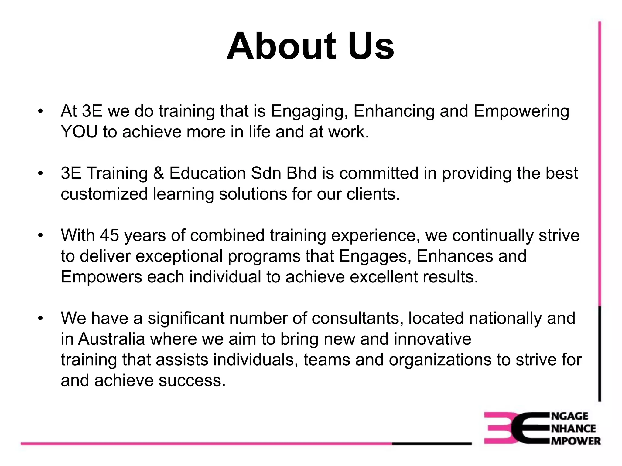 Training & Education Sdn Bhd is a training company committed to providing engaging, enhancing, and empowering training programs. They have 45 years of combined experience and consultants located nationally and in Australia. Their training approach focuses on having the right people in the right roles with the right managers to drive employee engagement, believing that engaged employees drive customer engagement and engaged customers drive sustainable growth. They provide various programs targeting these areas, including assessments, leadership programs, and customer service training. Their team of trainers have diverse backgrounds and specialize in areas like human resources, finance, communication skills, and Montessori education.