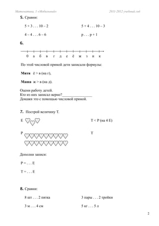 Документ представляет собой проверочную работу по математике для учащихся 1 класса, посвященную разностному сравнению величин и действиям сложения и вычитания. В нем содержатся задания на числовой прямой, сравнение чисел и формулировку математических утверждений с разбором ошибок в детских записях. Оценочный лист включает критерии и баллы за выполнение заданий.