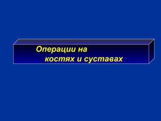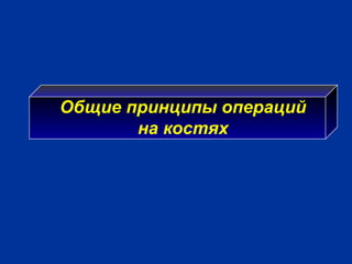 Документ описывает принципы и методы операций на костях и суставах, включая внутрикостную анестезию, остеотомию и остеосинтез. Приведены показания, этапы выполнения процедур и способы костной пластики, а также различные хирургические методы, такие как артротомия, резекция и артродез. Обсуждаются условия успешного заживления и ключевые этапы каждой процедуры, подчеркивая важность анатомической точности и сохранения кровоснабжения.