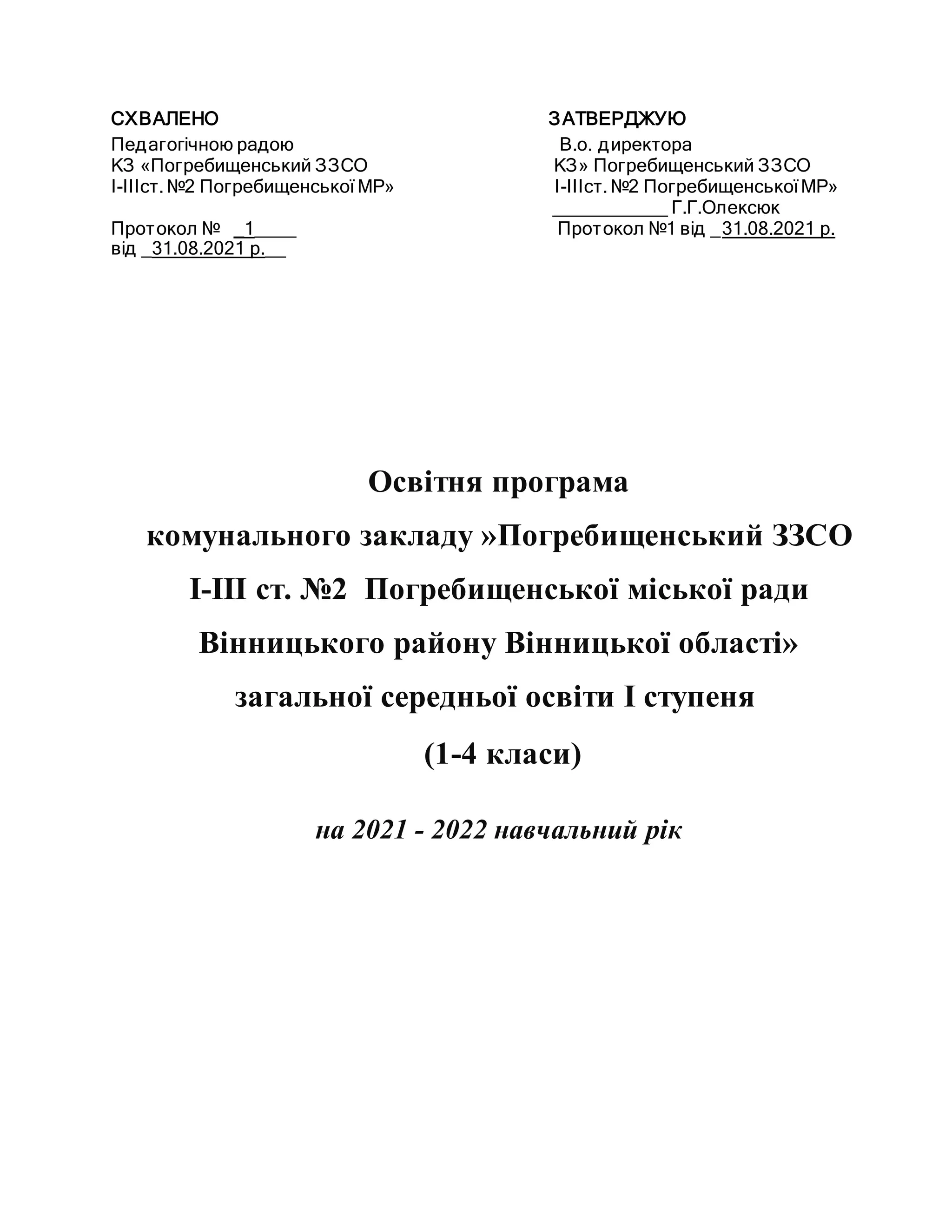 Освітня програма комунального закладу »Погребищенський ЗЗСО І-ІІІ ст. №2 Погребищенської міської ради Вінницького району Вінницької області» загальної середньої освіти І ступеня (1-4 класи) на 2021 - 2022 навчальний рік