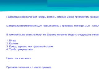 Документ описывает наборы спален Bella с различными вариантами комплектации, включая шкафы, кровати, комоды и туалетные столики, доступные в разных цветах и материалах. Указаны размеры и возможные элементы для каждой модели спальни, таких как Bella Quarta, Sofie, Marselain и другие. Также перечислены различные варианты цветового оформления для каждой спальни.