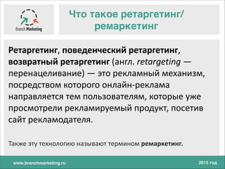 Документ рассматривает систему ретаргетинга и ремаркетинга, направленные на возврат пользователей, которые покинули сайт без совершения покупки. Описываются механизмы работы ретаргетинга через такие платформы, как Google и Яндекс, а также особенности настройки и сегментации аудитории. Приводятся примеры и рекомендации по эффективному использованию ретаргетинга в рекламных кампаниях.