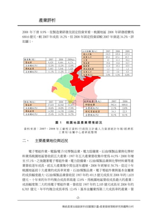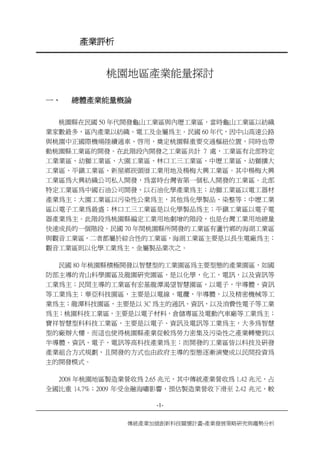 本文件分析了桃園地區產業發展的歷史與現況,指出由傳統產業向高科技產業的轉型過程。重點在於電子零組件、電腦/電子/光學製品等領域的成長,並提及創新能量的不足需政策支持。從不同時間段的裕度分析,顯示出桃園地區的電子產業仍面臨挑戰,但在某些領域已顯示出優勢。