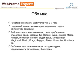 Документ представляет собой анализ работы отдела контекстной рекламы компании WebPromo, где руководитель Анастасия Едаменко описывает свои достижения и проблемы в рекламных кампаниях. Основное внимание уделяется настройке Google Analytics, созданию аккаунта Google Adwords и оптимизации доходов от контекстной рекламы, которая показала рост ROI до 2053,92%. Перспективы развития включают запуск ремаркетинга и кампаний в Яндексе.