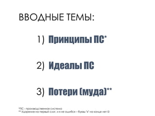Документ описывает принципы производственной системы, акцентируя внимание на важности клиента и необходимости вовлечения сотрудников в процесс улучшения качества. Основные принципы включают заботу о потребностях заказчика, ценность людей как активов и культуру кайдзен для непрерывного совершенствования. Важное внимание уделяется организации труда для устранения потерь и повышения эффективности.