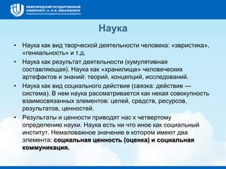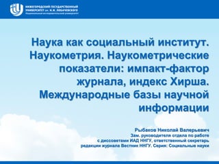 Документ рассматривает науку как социальный институт, акцентируя внимание на наукометрии и ее показателях, таких как импакт-фактор и индекс хирша. Обсуждаются функции научных публикаций, их роль в научной коммуникации и критические аспекты воздействия наукометрических индикаторов на оценку результатов научной деятельности. Также представлены исторические примеры развития научных журналов и баз данных, таких как Scopus и Web of Science.