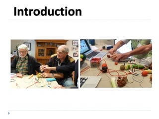 This document discusses an experiment using the MaKey MaKey conductive kit to allow older adults to create their own musical instruments and explore new technologies. The kit allows users to connect everyday objects like fruit to a computer to turn them into piano keys. The conclusions suggest future kits should be designed for open-ended use and adoption rather than contained activities, as a large part of design occurs through experimentation and use. The document promotes the benefits of introducing new technologies to older populations in an accessible and creative way.