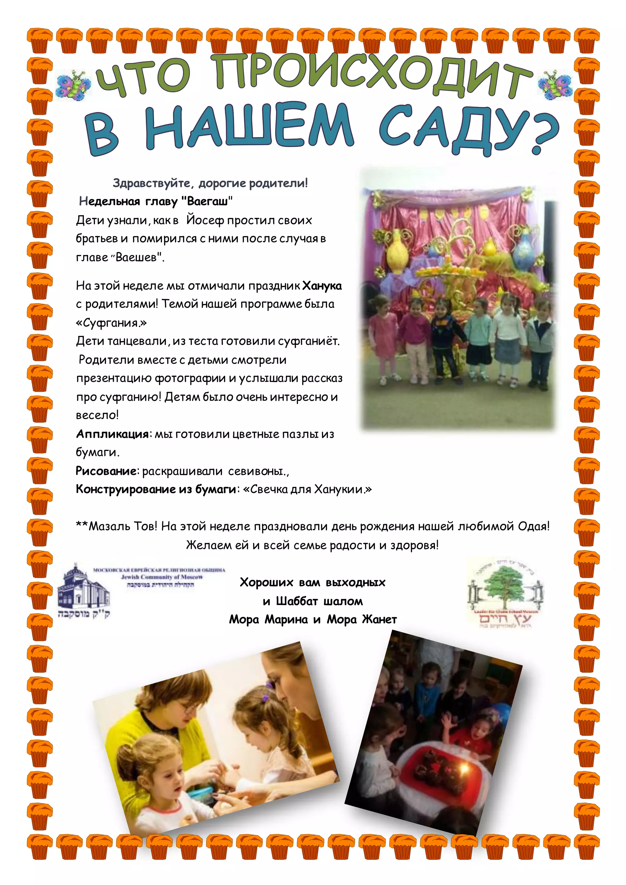 На этой неделе дети узнали о примирении Иосифа с братьями и отмечали праздник Ханука с родителями. В рамках празднования они готовили суфганиёт, танцевали и участвовали в различных творческих активностях, таких как раскрашивание и конструирование. Также был отмечен день рождения ученицы Одии с пожеланиями радости и здоровья.